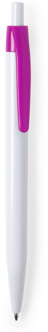Kugelschreiber mit Push-up-Mechanismus in auffälligem, zweifarbigem Design. Gehäuse in weißer Farbe und Clip in verschieden breiten Farben. Großer Druckbereich und blaue Tintenmine.