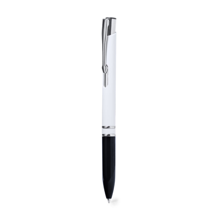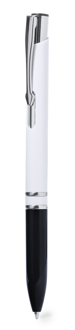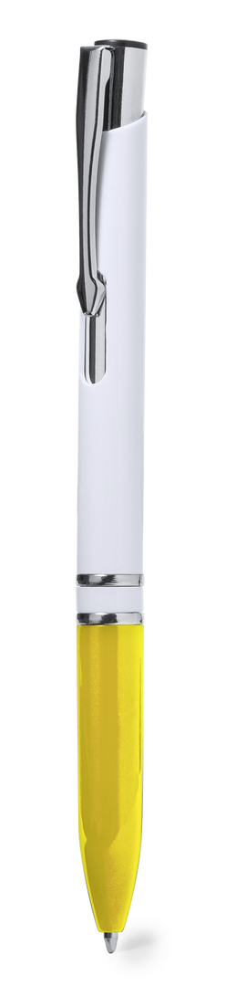Eleganter Kugelschreiber mit Druckknopfmechanik. Mit glänzend weißem Gehäuse und Griff in verschiedenen Farben. Aus strapazierfähigem ABS-Glanzlack. Mit Jumbo-Mine und blauer Tinte.