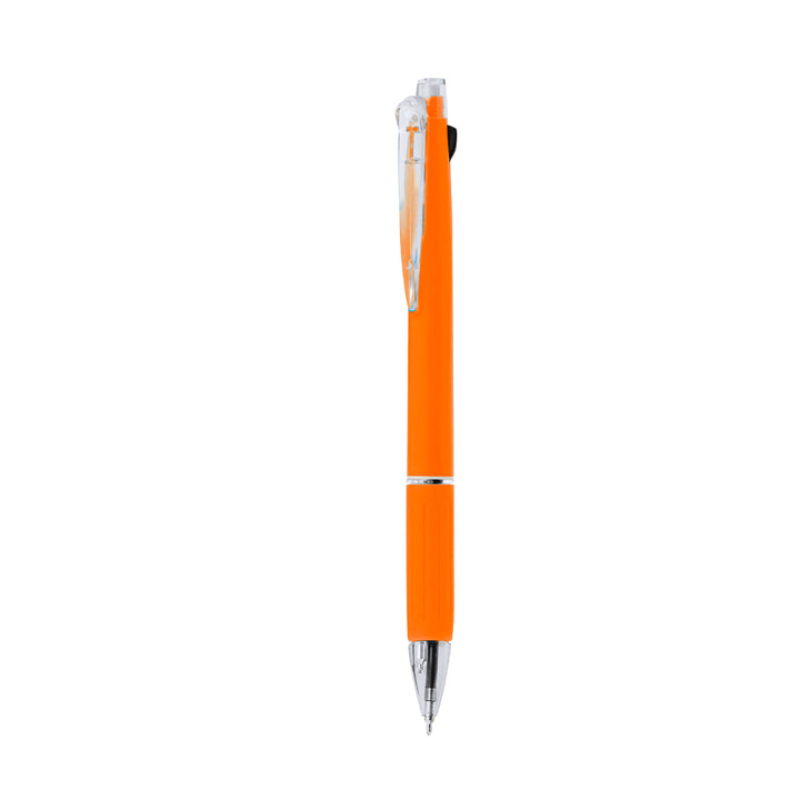 Praktischer Kugelschreiber. Druckknopfmechanismus, mit roter und schwarzer Tinte und Druckbleistift. Passende Druckknöpfe und weicher Griff mit angenehmer Haptik, mit transparentem Clip und Spitze. Lauf in verschiedenen leuchtenden Farben, mit Zeiger oben.