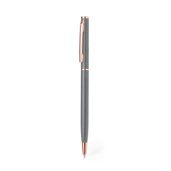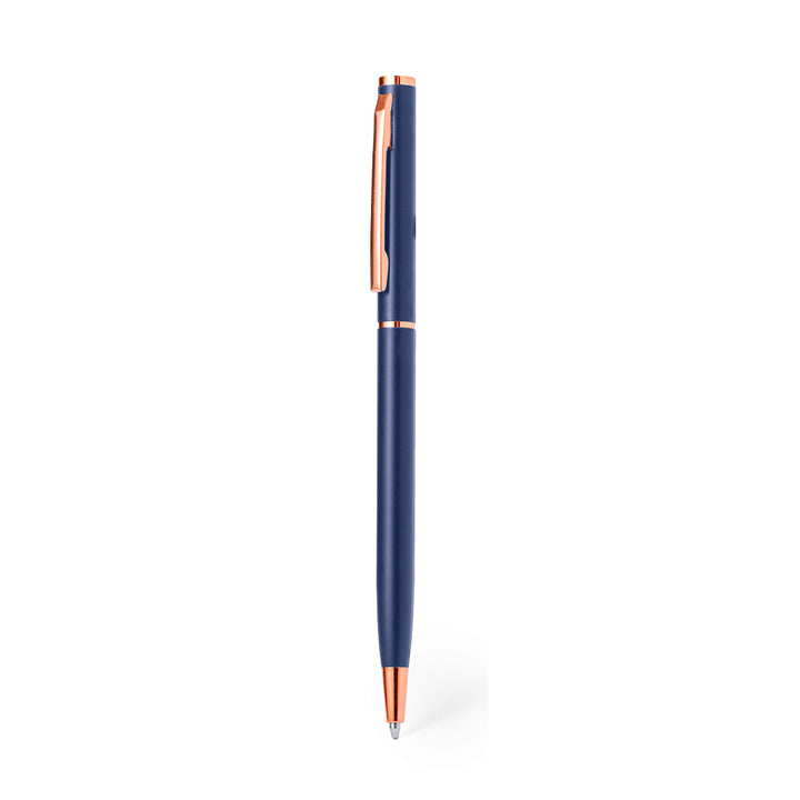 Hervorragender Kugelschreiber aus Aluminium mit Drehmechanismus. Robuster, mattierter Aluminiumschaft mit dekorativen Elementen in eleganter Kupferoptik, mit Schaft in einer großen Auswahl an markanten Farben. Metallclip und blaue Tinte. Präsentiert in einer einzelnen recycelten Tasche.