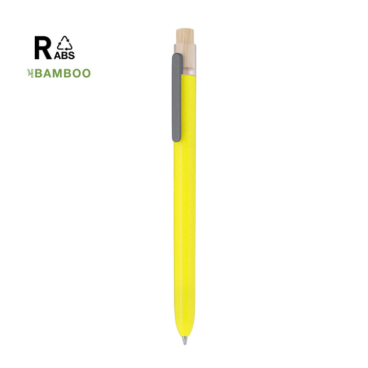 Kugelschreiber aus RABS. Mit einem metallischen Clip und Druckmechanismus aus Bambus. In blauer Tinte. RABS-Label auf der Oberseite des Kugelschreibers.RABS ist ein hochgradig recycelbarer Kunststoff mit hoher Widerstandsfähigkeit und vielseitigen der ihn zu einer umweltfreundlichen Lösung macht.Anwendungen