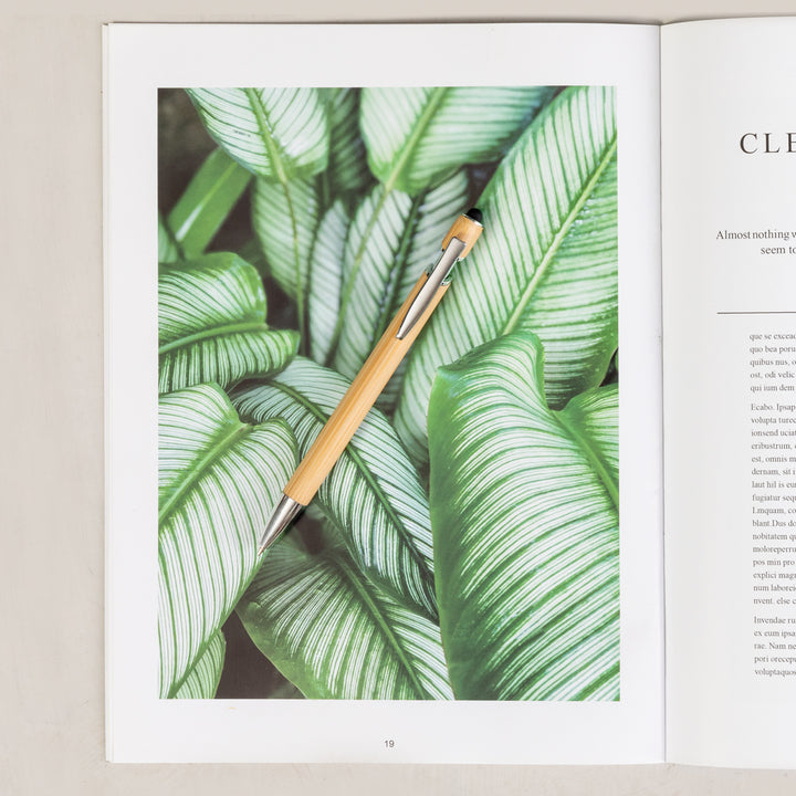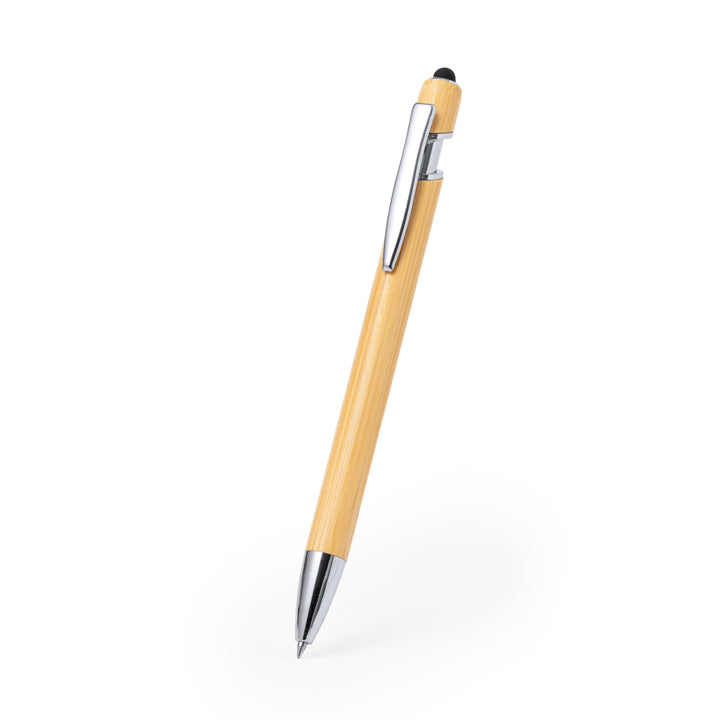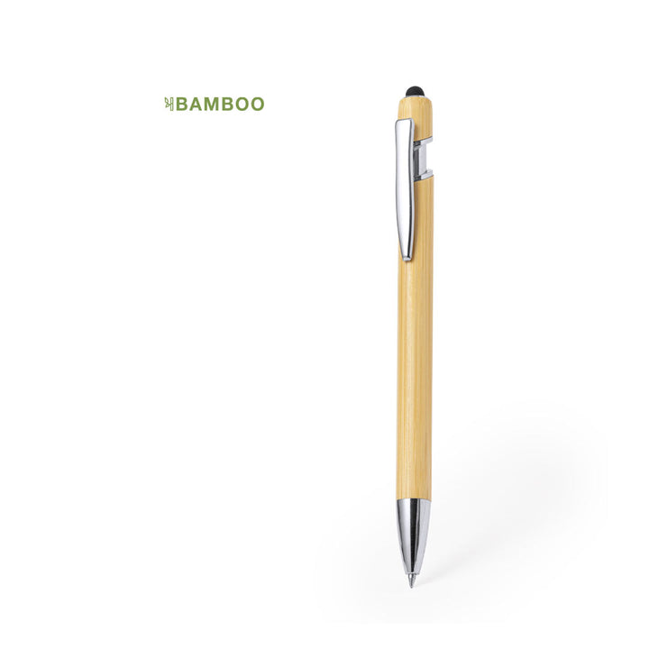 Kugelschreiber mit Druckknopfmechanismus, Bambusschaft, verchromten Beschlägen und schwarzem Zeiger. Metallclip und blaue Tinte. Materialien wie Bambus fördern die Nutzung natürlicher Rohstoffe und reduzieren so den Schadstoffausstoß. Es stammt von einer äußerst widerstandsfähigen und vielseitigen Pflanze mit schnellem Wachstum und Regeneration, was es zu einer hervorragenden Alternative zur Verwendung von herkömmlichem Holz macht.