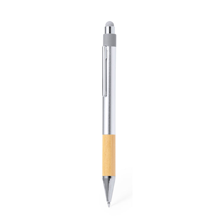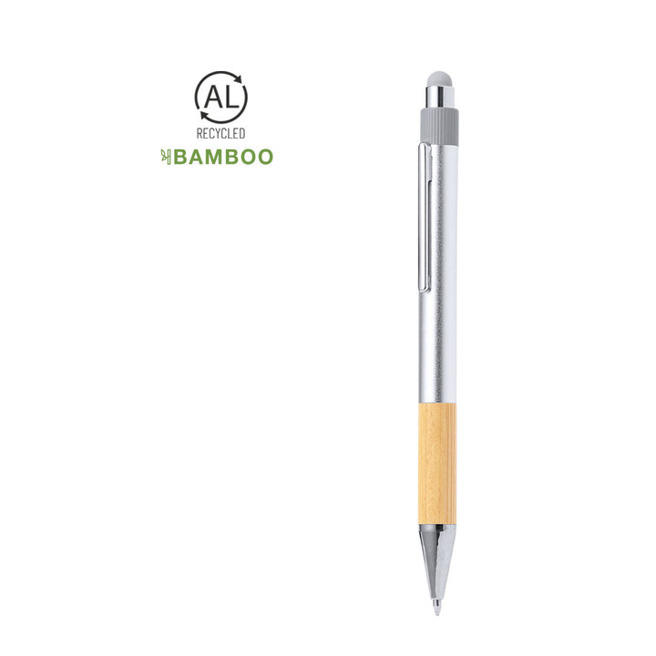 Das mattierte Aluminiumgehäuse ist besonders strapazierfähig und verleiht dem Stift eine schlichte, aber elegante Optik. Der Bambusgriff bietet eine natürliche Haptik, während der graue Zeiger dem Kugelschreiber einen modernen Touch verleiht. Ein praktischer Metallclip ermöglicht eine einfache Befestigung des Stiftes an Taschen oder Notizbüchern.
