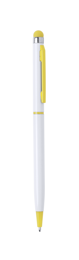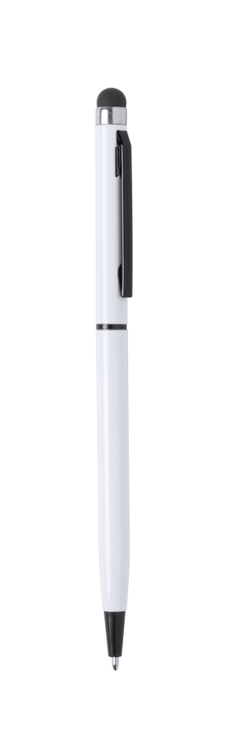 Dreh-Kugelschreiber mit weißem Aluminiumgehäuse und Kontrastdetails in verschiedenen glänzenden Farben. Mit gestanztem Clip und blauer Tinte.
