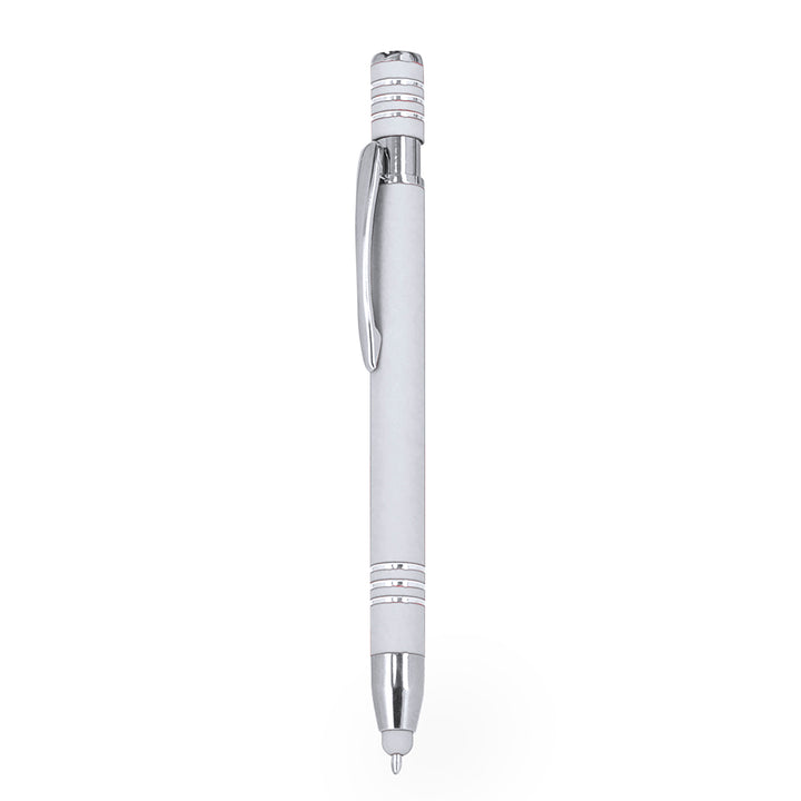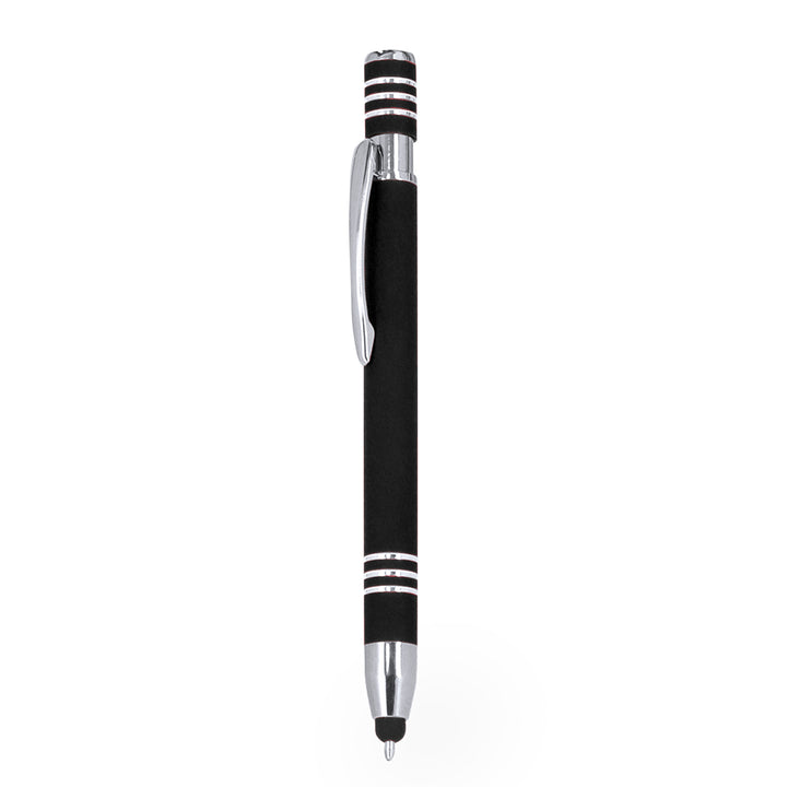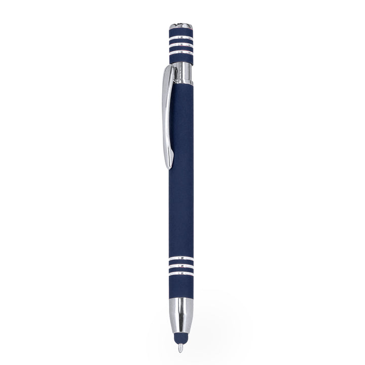 Kugelschreiber mit Druckmechanismus und Stylus, aus Aluminium. Gummierte Oberfläche, speziell für Lasergravur entwickelt, die das Logo in Silberton enthüllt. Verchromte Beschläge und passender Clip inklusive. Blaue Tinte.