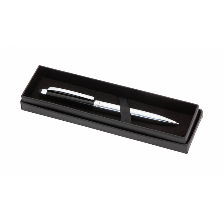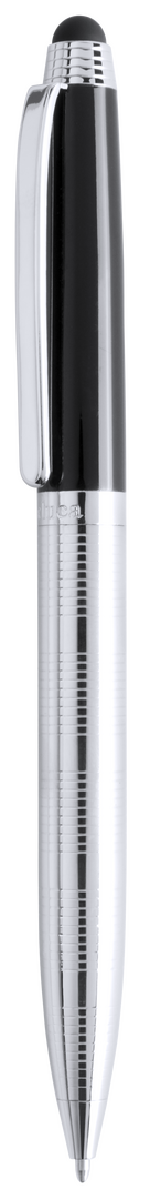 Dreh-Kugelschreiber mit Stylus von Alexluca. Mit angenehm weichem Metallschaft in einer Kombination aus elegantem Schwarz mit Silber. Clip und Griff in passender Farbe. Präsentiert in einem individuellen schwarzem Etui mit Markenlogo. Blaue Tinte.