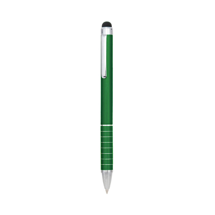Dreh-Kugelschreiber mit Aluminiumgehäuse in Metallic-Ausführung in kräftigen Farben. Mit Stylus. Kontrastelemente und Ringe in Silber. Origineller Ring-Griff und blaue Tinte.