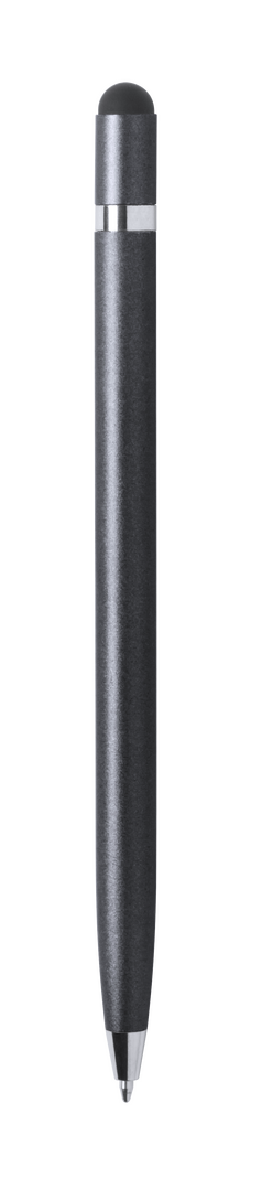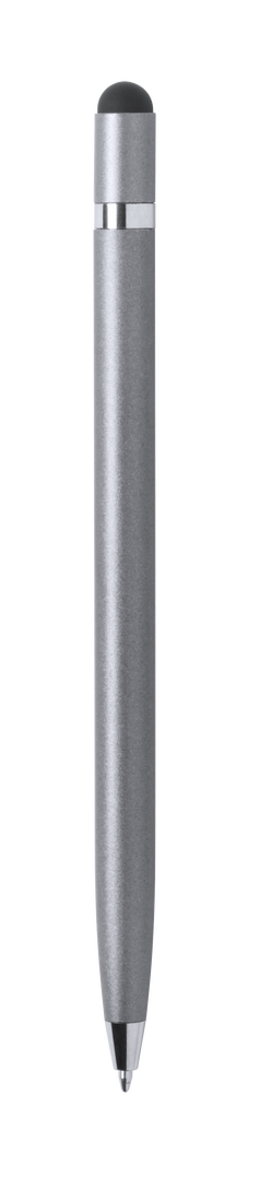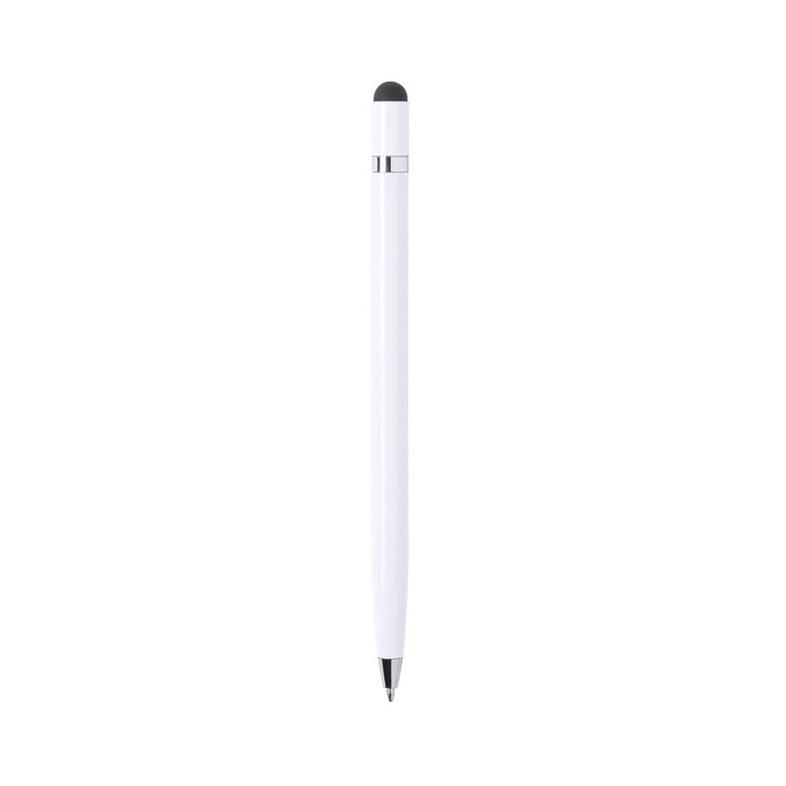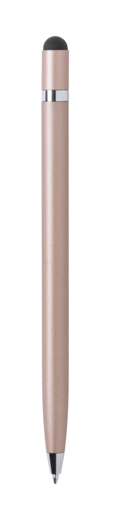Dreh-Kugelschreiber mit Stylus aus Aluminium mit geschmeidigem Metallic-Finish und verchromtem Ring. Erhältlich in Gold, Rosa und Silber in glänzender Ausführung sowie Weiß in matter Ausführung. Blaue Tinte.
