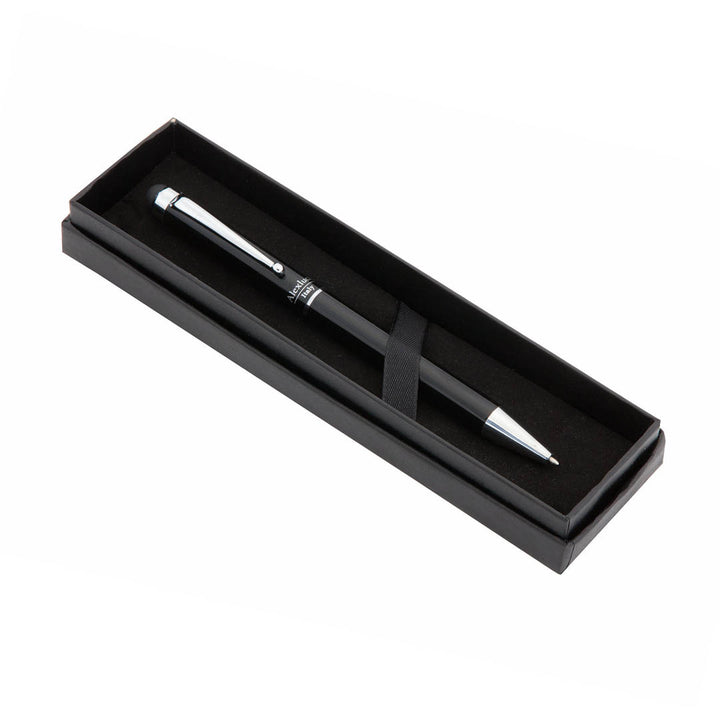 Dreh-Kugelschreiber mit Stylus von Alexluca. Mit angenehm weichem Metallschaft in elegantem Schwarz. Clip und Spitze in passender Farbe. Präsentiert in einem individuellen schwarzem Etui mit Markenlogo. Blaue Tinte.