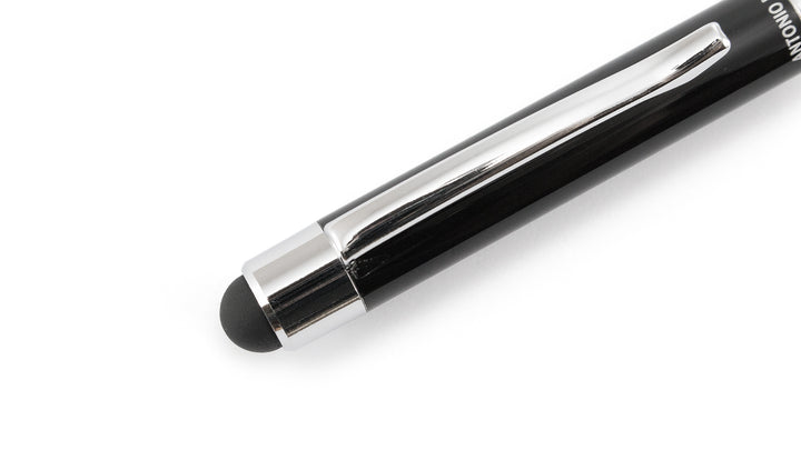 Dreh-Kugelschreiber von Antonio Miró mit geschmeidigem Metallschaft in einer eleganten Schwarz/Silber-Kombination. Mit Clip und Spitze in passender Farbe. Präsentiert in einer individuellen schwarzen Schachtel mit dem Markenlogo. Blaue Tinte.