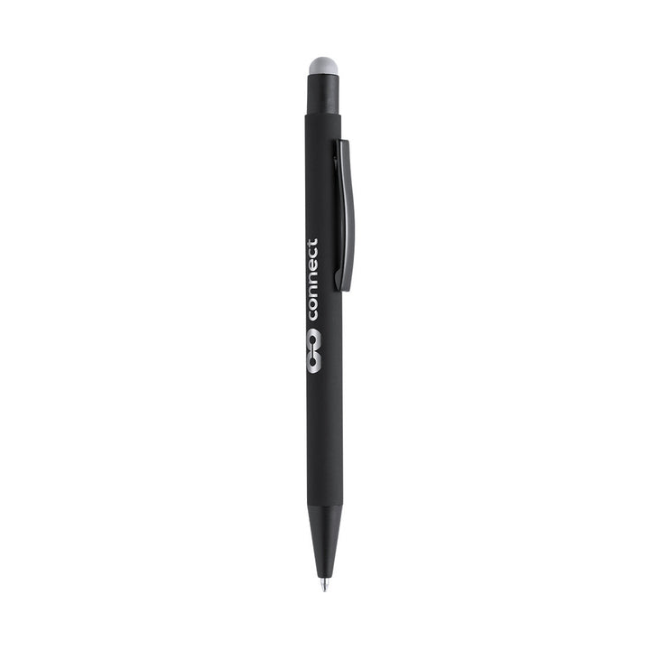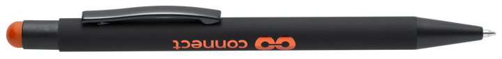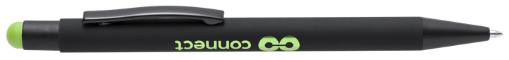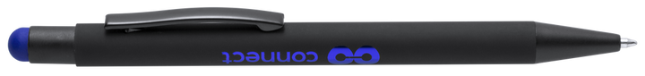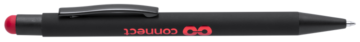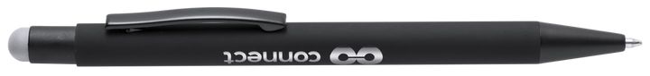 Dreh-Kugelschreiber in Schwarz mit Stylus und Druckknopf in verschiedenen Farben. Mit Metall-Clip in Schwarz. Speziell für den Laserdruck entworfen und mit einer speziellen Außenbeschichtung versehen, durch die Ihr Logo perfekt graviert wird - passend zur Farbe des Druckknopfes. Jumbo-Patrone mit blauer Tinte.