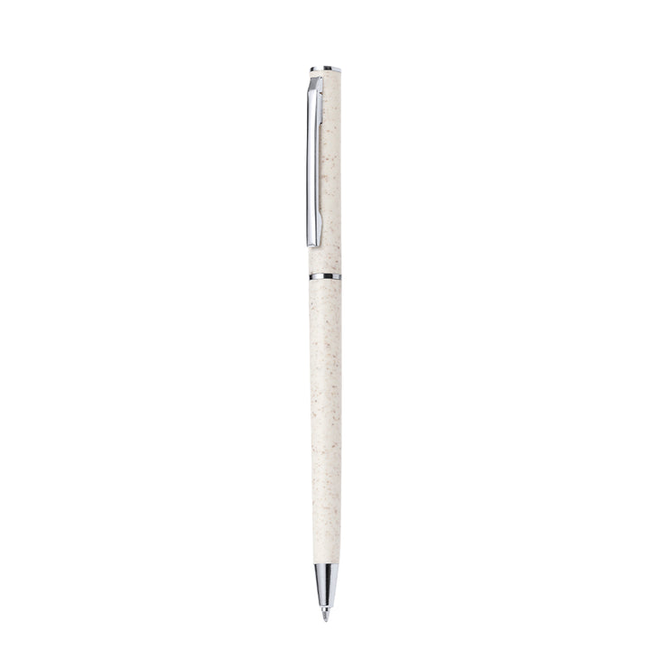 Kugelschreiber mit Schaft aus Weizenstroh. Mit Metallclip und verchromten Beschlägen, Drehmechanik und blauer Tinte. Mit Weizenstroh-Logo und in einer Naturfarbe erhältlich.Weizenstroh fördert die Verwendung von natürlichen Rohstoffen und reduziert so den Schadstoffausstoß.