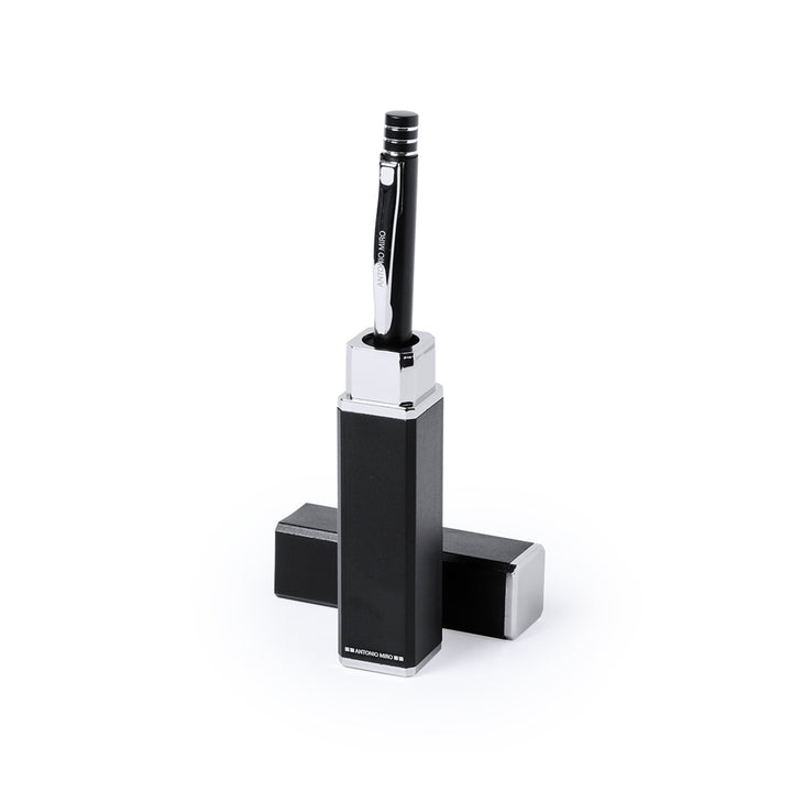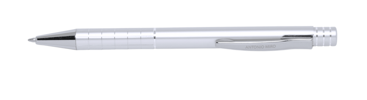 Dreh-Kugelschreiber von Antonio Miró mit elegantem Design und geschmeidigem Aluminiumgehäuse mit silbernen Kontrastdetails. Druckknopf mit Ring-Design und origineller Metallclip. Präsentiert in einem individuellen Aluminium-Case in Schwarz mit dem Markenlogo. Blaue Tinte.