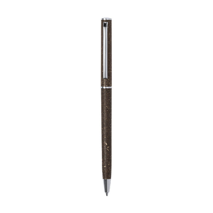 Kugelschreiber mit Schaft aus Kaffeefasern, Metallclip und verchromten Beschlägen. Drehmechanismus und blaue Tinte. Mit Logo für Kaffeefasern und in natürlicher Farbe erhältlich.Kaffeefaser ist eine Kreislauflösung, die aus der Verwendung von Abfällen der Kaffeeproduktion gewonnen wird. Eine nachhaltige Alternative, die die Reduzierung des Plastikverbrauchs fördert, Energie im Herstellungsprozess spart und zum Umweltschutz beiträgt.