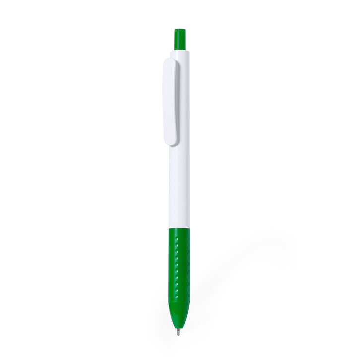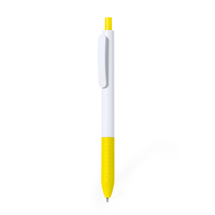 Druckkugelschreiber aus widerstandsfähigem ABS. Hergestellt in einer eleganten Kombination aus Schaft und Clip in Weißtönen. Druckknopf und Griff sind in verschiedenen leuchtenden Farben erhältlich. In blauer Tinte.