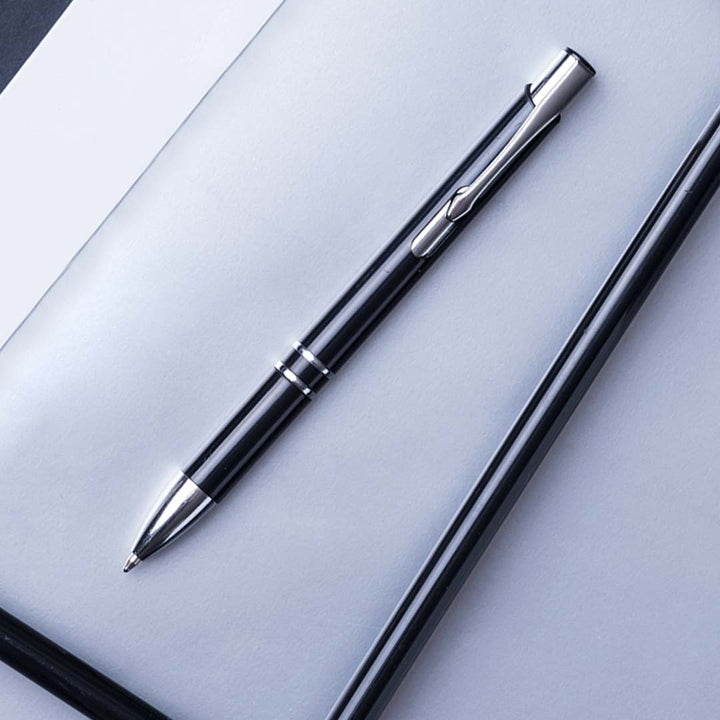 Druck-Kugelschreiber in einer Vielzahl von glänzenden Farben. Mit verchromten Kontrastdetails und originellem Design. Jumbo-Patrone mit blauer Tinte.