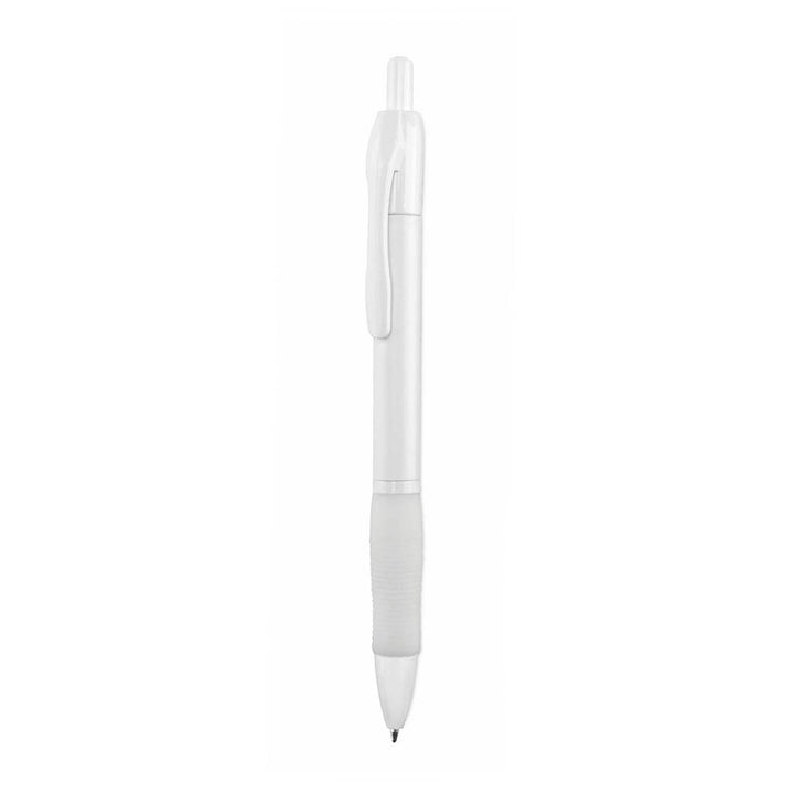 Klassischer Druck-Kugelschreiber mit auffälligem Design und solidem, weißem Schaft mit komfortablem Griff und farblich passendem Clip. Blaue Tinte.