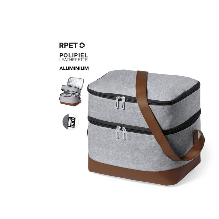 Die Kühltasche Chandak bietet eine ideale Möglichkeit, Lebensmittel unterwegs kühl und frisch zu halten. Sie besteht aus robustem 600D RPET-Gewebe und ist mit einem eleganten braunen PU-Lederboden ausgestattet, der dem Design eine besondere Note verleiht. Die Tasche in grauer Farbe kommt mit einem praktischen Schulterriemen, der den Transport erleichtert.