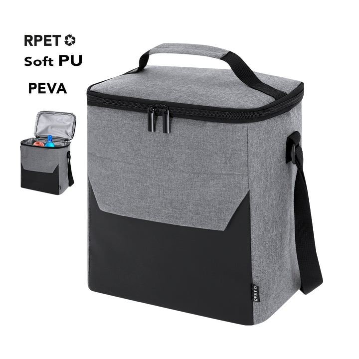 Kühler aus strapazierfähigem RPET 600D in Kombination mit PU. Enthält Hauptfach, mit Reißverschluss und doppeltem Metal-Reißverschluss, mit isoliertem inneren PEVA. Vordertasche mit Reißverschluss. Mit verstellbarem Schultergurt und gepolstertem Handgriff an der Oberseite. Externe Etikett mit RPET-Auszeichnung.Das RPET-Material wird aus recyceltem Kunststoff hergestellt, um die Wiederverwendung von Plastikabfällen zu fördern und zur Nachhaltigkeit des Planeten beizutragen.
