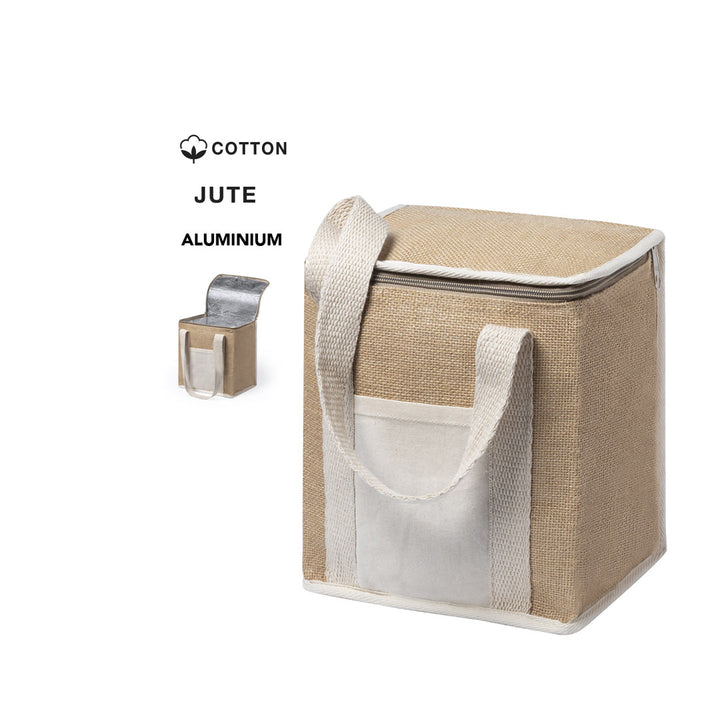 Gefertigt aus robustem und feuchtigkeitsabweisendem Jutestoff mit einer laminierten Oberfläche, überzeugt die Tasche durch ihre Langlebigkeit und ihr ansprechendes Design. Der isothermische Innenraum, ausgekleidet mit Aluminium, sorgt für eine hervorragende Isolierung und bewahrt die Temperatur der Inhalte über längere Zeit.