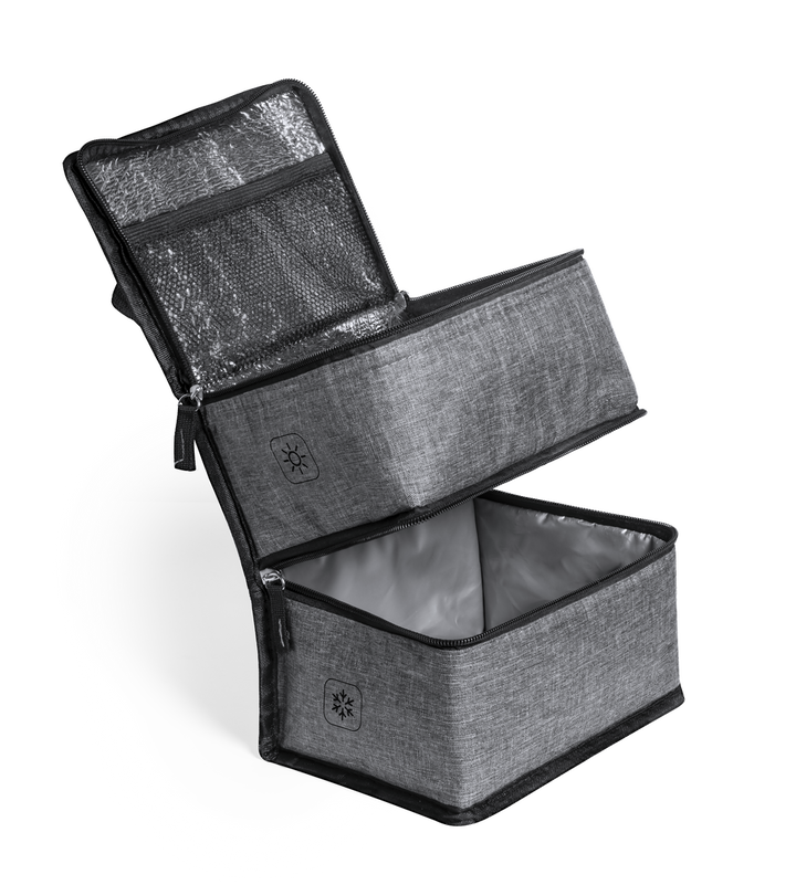 Mit ihren zwei praktischen Fächern bietet die Kühltasche viel Stauraum für unterschiedliche Lebensmittel. Das obere Fach, ausgestattet mit einer Aluminium-Innenseite, hält warme Mahlzeiten konstant auf Temperatur, während das untere Fach mit einer PEVA-Isolierung kühle Getränke oder Snacks frisch hält. Beide Fächer sind mit Reißverschlüssen ausgestattet, die für eine sichere Aufbewahrung sorgen.