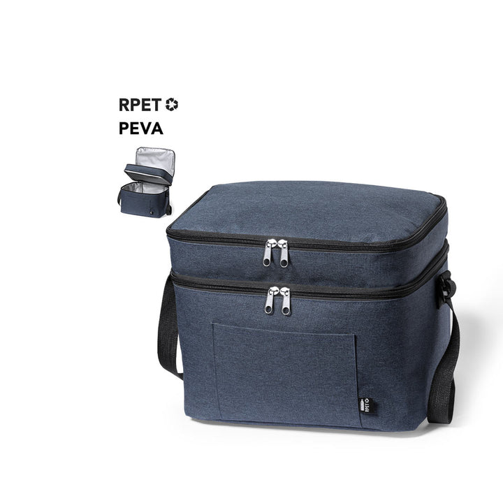 Dank des RPET-Etiketts auf der Außenseite, das den Einsatz von recyceltem Kunststoff zeigt, leistet diese Kühltasche einen Beitrag zur Reduzierung von Plastikabfällen und fördert Nachhaltigkeit.