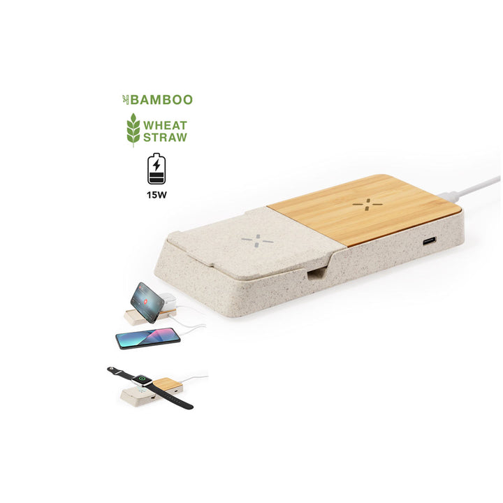 Das Ladegerät Barichen vereint modernes Design mit ökologischer Verantwortung und bietet eine innovative Lösung für das gleichzeitige Laden mehrerer Geräte. Gefertigt aus einer nachhaltigen Kombination von Bambus und Weizenstroh, setzt dieses kabellose Ladegerät ein Zeichen für umweltfreundliche Technologien. Mit einer Leistung von 15 W, Typ-C-Ausgängen und der Möglichkeit, Smartphone, Smartwatch und Kopfhörer parallel aufzuladen, ist es eine vielseitige Ladestation für den Alltag.