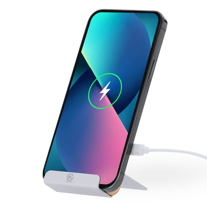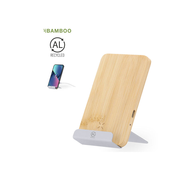 15W Wireless-Ladegerät mit Smartphone-Halterfunktion, hergestellt aus Bambus und recyceltem Aluminium. LED-Ladestatusanzeige und kompatibel mit Geräten, die über kabellose Ladetechnologie verfügen, einschließlich Typ-C-Kabel. Mit recyceltem Aluminium-Logo.Materialien wie Bambus fördern die Nutzung natürlicher Rohstoffe und reduzieren so die Schadstoffemissionen. Es stammt von einer sehr widerstandsfähigen und vielseitigen Pflanze mit schnellem Wachstum und Regeneration, was es zu einer hervorragenden Alternative zur Verwendung von traditionellem Holz macht.Recyceltes Aluminium ist ein Material mit nahezu unendlichen Recyclingmöglichkeiten, ohne seine ursprünglichen Eigenschaften zu verlieren und dabei weniger Energie zu verbrauchen.GRS (Global Recycled Standard)-Zertifizierung, die den recycelten Ursprung des zur Herstellung des Produkts verwendeten Materials garantiert.Hergestellt nach RoHS-Standards und in Übereinstimmung mit den folgenden Sicherheitsanforderungen:Überhitzungsschutzsystem.Überladeschutzsystem.Sperrsystem zur Vermeidung von Kurzschlüssen.
