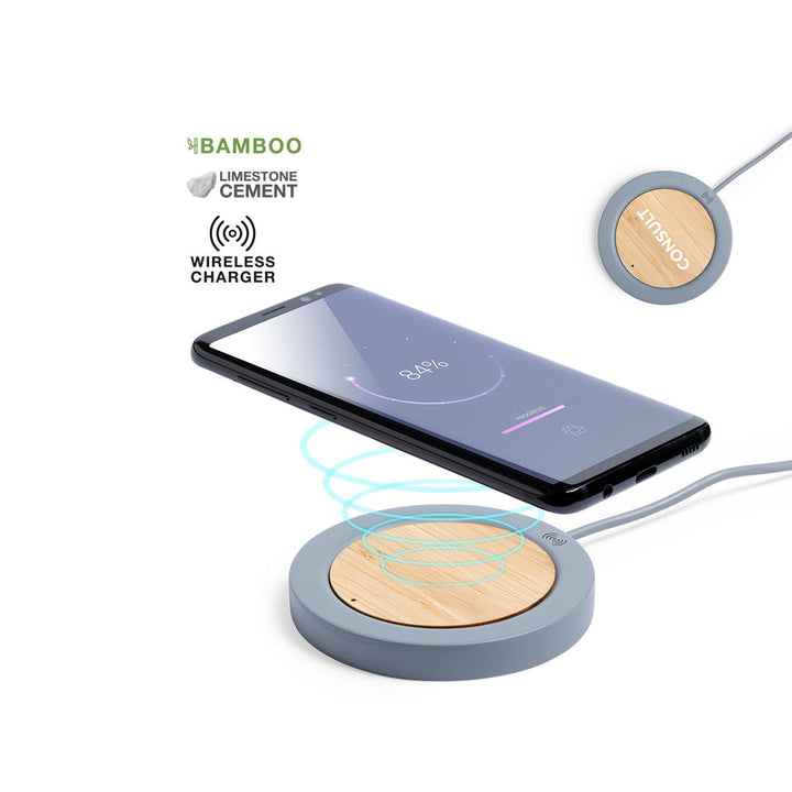 Drahtloses Ladegerät mit rundem Design in Kombination aus natürlich geschnittenen Bambusstücken und Kalksteinzement, einem Konglomerat, das durch die Mischung natürlicher Materialien, hauptsächlich gemahlener Kalkstein und Wasser, gebildet wird, wodurch ein Material von großer Konsistenz und Haltbarkeit entsteht.USB-Ladekabel in passender Farbe, kompatibel mit Geräten, die mit drahtloser Ladetechnologie ausgestattet sind. Sicherheitsschutz zur Vermeidung von Überhitzung, Überladung und Kurzschluss. Präsentiert in einer attraktiven Design-Box.