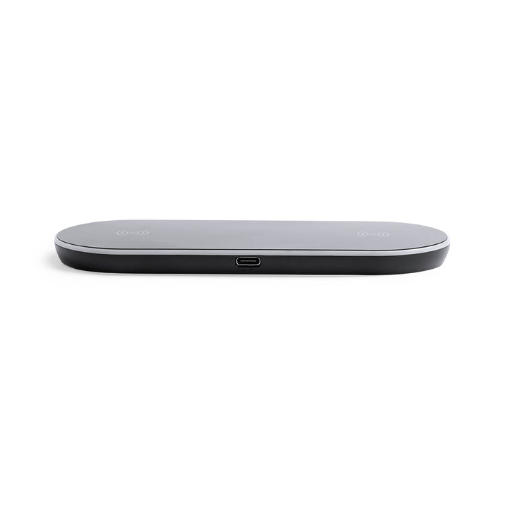 Cargador inalámbrico para carga simultánea de hasta 2 dispositivos. En elegante color negro, con luz led interior y un recubrimiento exterior especialmente diseñado para marcaje en láser, con el que conseguirá que su publicidad o marca quede iluminada con luz blanca. Base antideslizante y compatible con dispositivos equipados con tecnología de carga inalámbrica. Presentado en atractiva caja de diseño. Cable USB incluido.