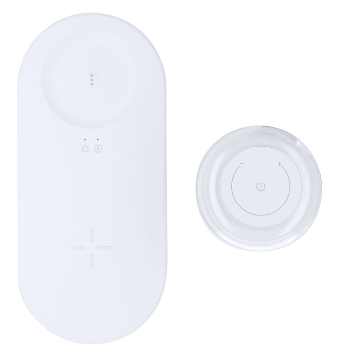 Multifunktionale Lampe. Sie enthält:- Tragbare kabellose Ladetischlampe mit 12 LEDs. Zusätzlich verfügt sie über 2 Lichtpositionen, die durch Berührungstasten einstellbar sind: eine Position mit weißem Licht und eine weitere mit verschiedenen Farben.- 15W kabelloser Ladegerät.