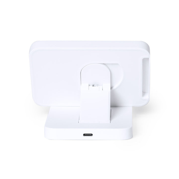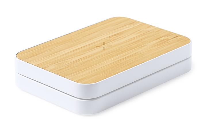 Cargador inalámbrico plegable 15W. Con base fabricada en resistente ABS de color blanco y superficie de carga en bambú, con soporte telescópico integrado. Compatible con dispositivos equipados con tecnología de carga inalámbrica Qi, con cable de carga Tipo C incluido. Presentado en caja individual de diseño kraft, con manual de instrucciones en español e inglés. Fabricado conforme a los estándares RoHS y en cumplimiento con los siguientes requisitos de seguridad: Sistema de protección contra sobrecalentamiento. Sistema de protección contra sobrecarga. Sistema de bloqueo para evitar cortocircuitos.