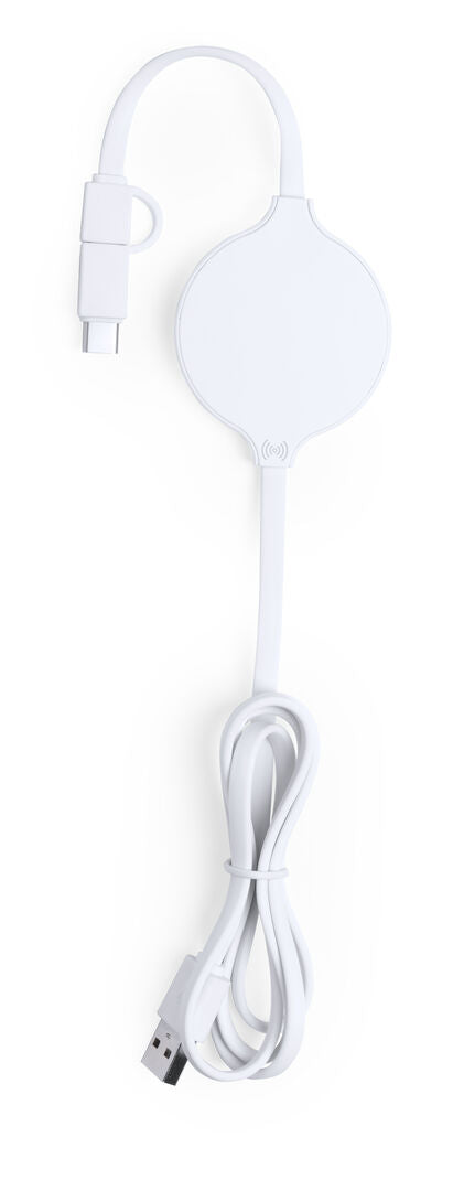 Cargador inalámbrico de diseño ultra compacto en diseño monocolor blanco. Conexión dual micro USB y Lightning, con adaptador Tipo C y luz indicadora de carga. Compatible con dispositivos equipados con tecnología de carga inalámbrica.