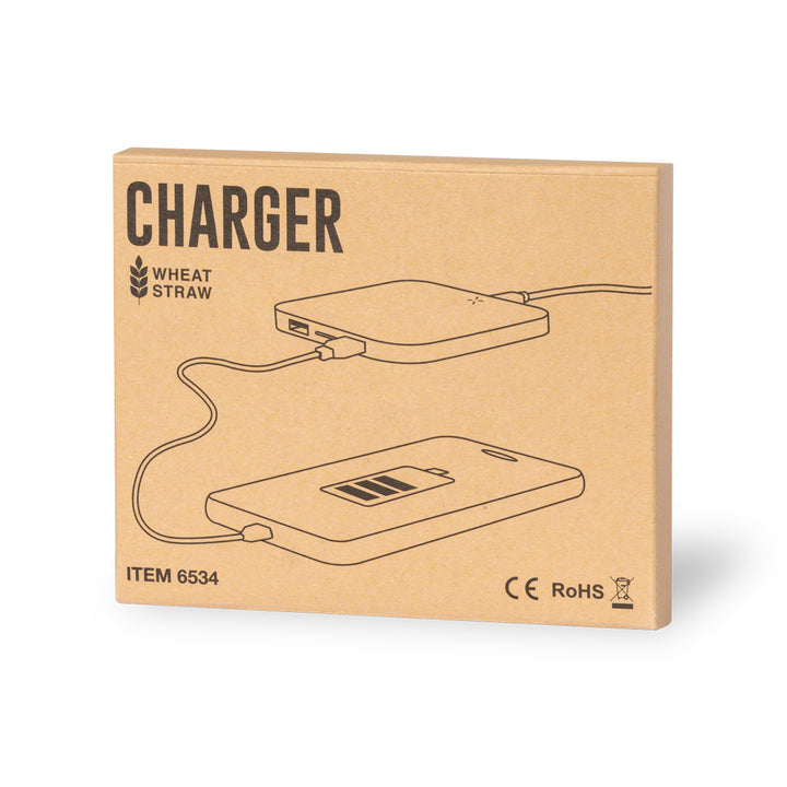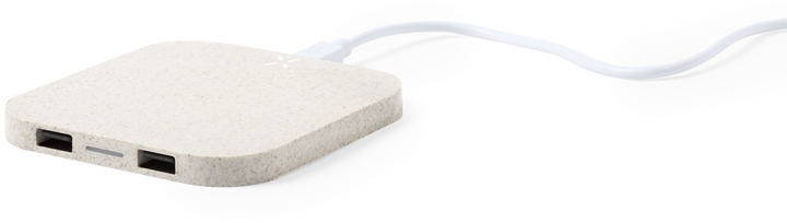 Kabelloses Ladegerät aus Naturlinie. Schale aus Weizenstroh, um die Verwendung natürlicher Rohstoffe zu fördern und Schadstoffemissionen zu reduzieren. 2.100 mA , doppelter USB-Ausgang zum gleichzeitigen Laden von bis zu 3 Geräten (1 Gerät drahtloses Laden und 2 Geräte über Kabel). Mit rutschfestem Sockel und kompatibel mit Geräten, die mit drahtloser Ladetechnologie ausgestattet sind. Präsentiert in einer attraktiven, umweltfreundlichen Design-Box.