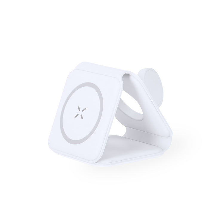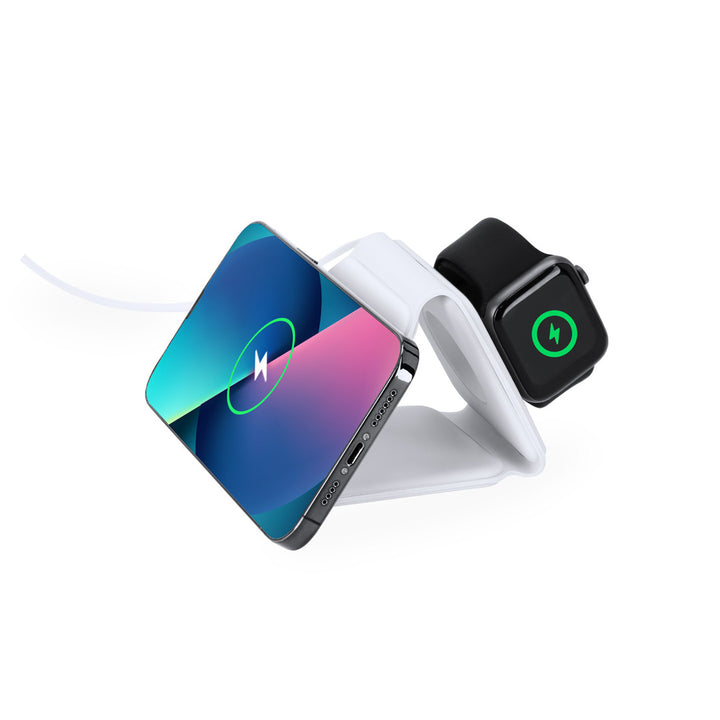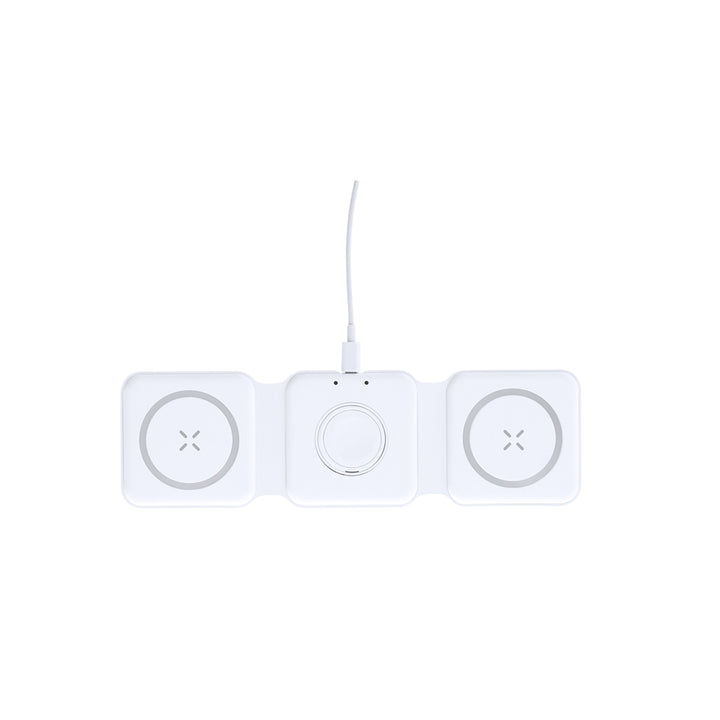 Komplettes magnetisches kabelloses Ladegerät 15W, entwickelt für das gleichzeitige Laden von Smartphone, Kopfhörern und Smartwatch. Ein All-in-One-Gerät: faltbar, tragbar, kompakt in der Größe, sehr vielseitig und funktional im Design. Anschluss über USB Typ C -Kabel inklusive- und hergestellt aus widerstandsfähigem, weißem ABS.Hergestellt gemäß RoHS-Standards und in Übereinstimmung mit den folgenden Sicherheitsanforderungen:Überhitzungsschutzsystem.Überladeschutzsystem.Sperrsystem zur Vermeidung von Kurzschlüssen.