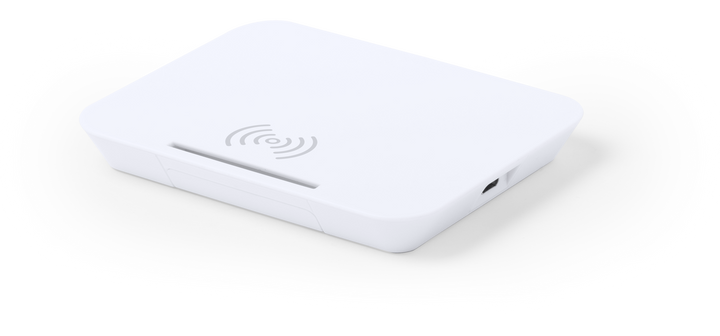 Cargador inalámbrico con función soporte de smartphone. De sobrio diseño monocolor en blanco, con cable de carga micro USB incluido. Compatible con dispositivos equipados con tecnología de carga inalámbrica. Presentado en atractiva caja de diseño.