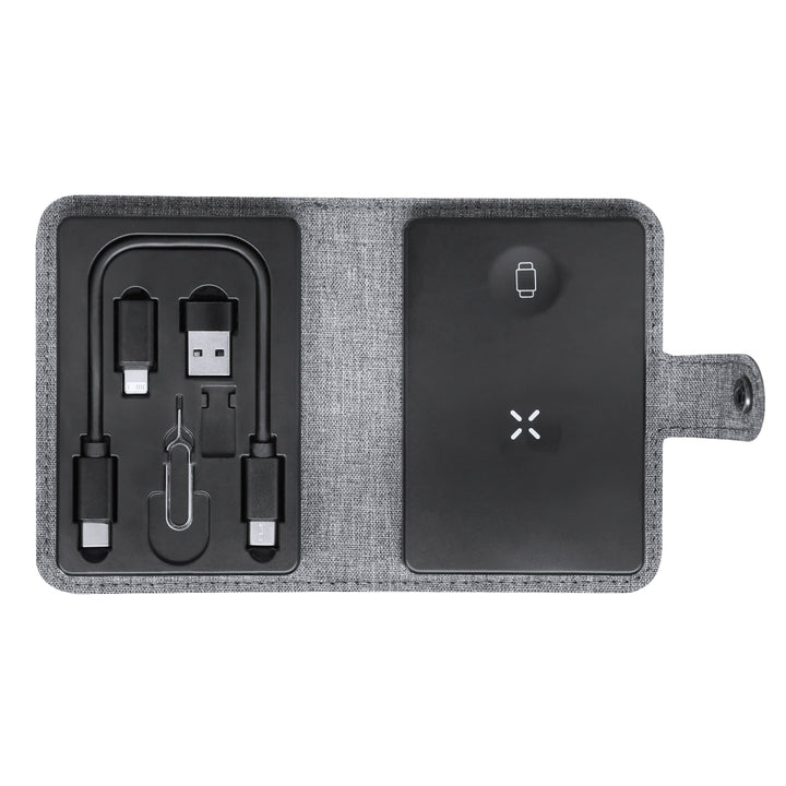 Komplette Ladestation aus 300D RPET. Kompaktes Gehäuse mit Druckknopfverschluss und inklusive Qi-Wireless-Ladestation für Smartphones, Kopfhörer und Smartwatches. Wird mit einem Typ-C-Verbindungskabel an beiden Enden geliefert, sowie USB- und Lightning/Micro-USB-Adaptern. Das Set wird durch einen SIM-Karten-Auswerfer und ein Fach zum Aufbewahren einer Micro-SIM-Karte vervollständigt. Mit RPET-Logo.RPET-Material besteht aus recyceltem Kunststoff, fördert somit die Wiederverwendung von Plastikabfällen und trägt zur Nachhaltigkeit des Planeten bei.