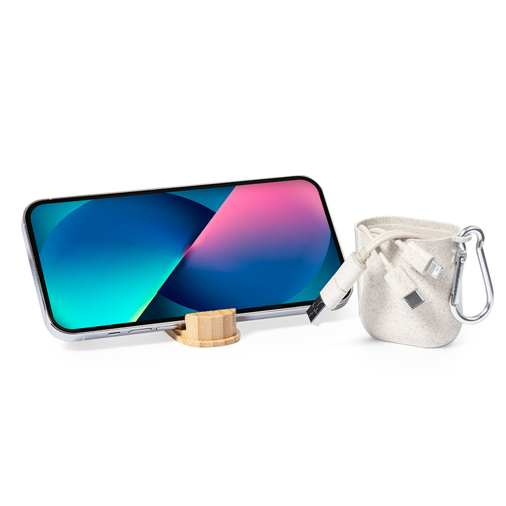 Ladekabel aus Weizenfaser. Mit Typ-C- und USB-Eingangsanschlüssen und Typ-C-, Lightning- und Micro-USB-Ausgängen. 5V DC 2.4A. Präsentiert in einem eleganten Design-Etui aus Weizenfasern und einem Deckel mit Bambusverschluss, mit Smartphone-Haltefunktion. Hergestellt aus pflanzlichen Elementen, um die Verwendung natürlicher Rohstoffe zu fördern und Schadstoffemissionen zu reduzieren.
