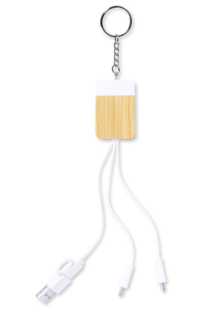 Cable cargador con llavero, fabricado en bambú y con detalle en extracto de mármol. Incluye conexiones de entrada USB y Tipo C, con salidas Lightning, Micro USB y Tipo C 5VDC 2.4A. Presentado en bolsa individual de diseño kraft.