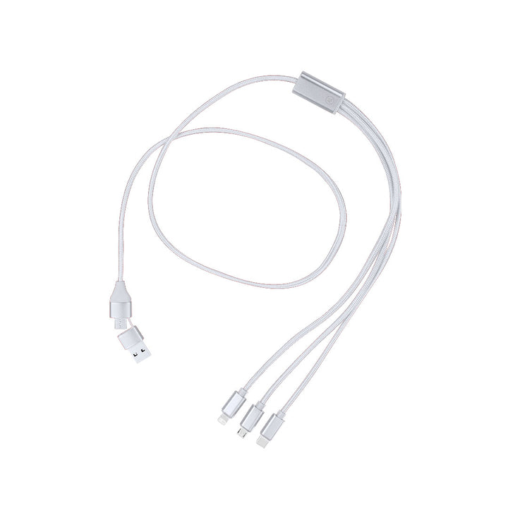 Ladekabel aus recyceltem Aluminium. Mit dualem Typ-C/USB-Eingang und Ausgängen Typ-C, Lightning und Micro-USB. Enthält ein Zeichen für recyceltes Aluminium.Recyceltes Aluminium ist ein Material mit nahezu unendlichen Recyclingmöglichkeiten, ohne dabei seine ursprünglichen Eigenschaften zu verlieren und weniger Energie in diesem Prozess zu verbrauchen.GRS-Zertifizierung (Global Recycled Standard), die die recycelte Herkunft des Materials garantiert, das zur Herstellung des Produkts verwendet wurde.Micro-USB-, Typ-C- und Lightning-Anschluss 5V DC 2.4A