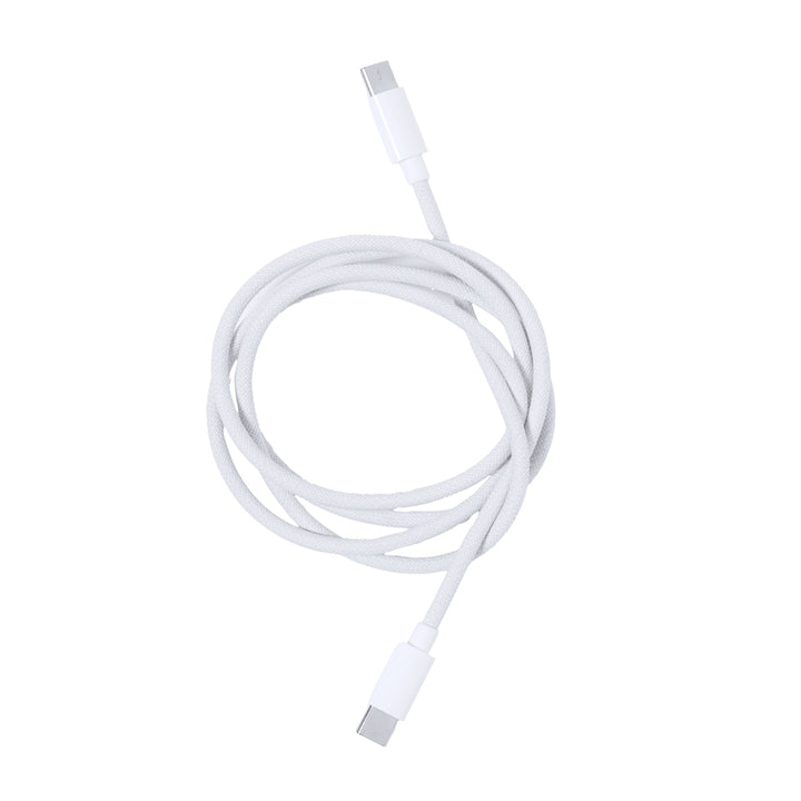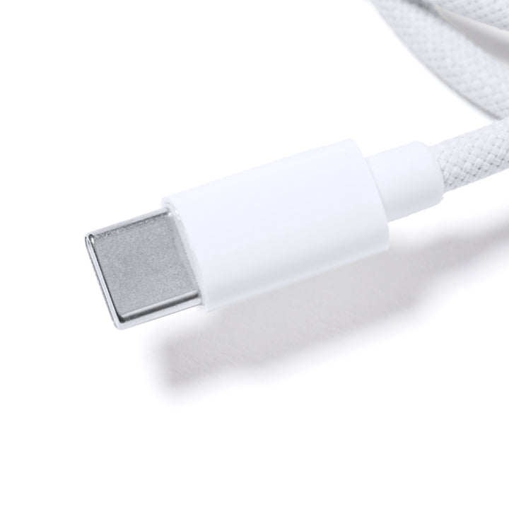 Ladekabel mit dualem Typ-C-Anschluss. 65 W Leistung und für die Datenübertragung geeignet. 100 cm lang, mit Aluminiumsteckern und in einem attraktiven Etui mit einem transparenten und einem undurchsichtigen Teil präsentiert. Mit Tragegriff und einzeln in einer recycelten Tasche präsentiert.