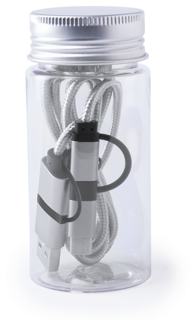 Ladekabel mit zwei Micro-USB/Lightning- und Typ-C-Anschlüssen (Eingang und Ausgang). 100 cm lang, mit Aluminiumsteckern und speziell für die Lasergravur entwickelt. Präsentiert in einer attraktiven transparenten Dose mit Schraubdeckel.