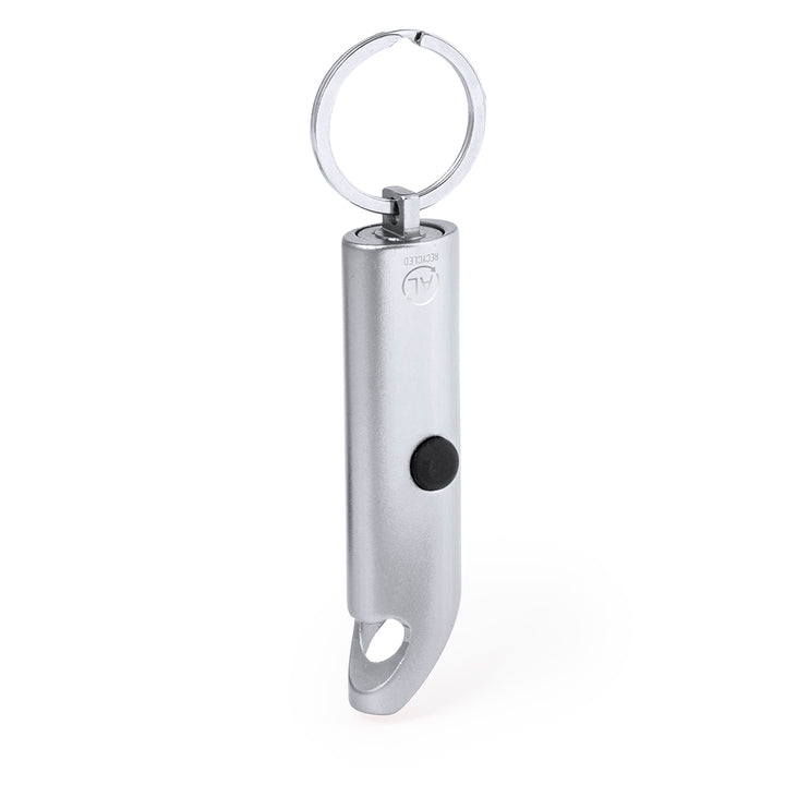 Langlebiger Schlüsselanhänger aus recyceltem Aluminium. Dieses praktische Accessoire verfügt über 3 LED-Leuchten und wird mit Knopfzellenbatterien betrieben (im Lieferumfang enthalten). Mit einem integrierten Öffner, der Vielseitigkeit in einem einzigen Gerät bietet. Mit Recycled-Aluminium-Logo an der Seite und in verschiedenen Farben erhältlich. Präsentiert in einer Kraft-Design-Box.Recyceltes Aluminium hat seinen Ursprung in der fast unendlichen Wiederverwendung eines der am besten recycelbaren Materialien, wobei die Qualität des Produkts erhalten bleibt. Diese Eigenschaft macht es zu einem umweltfreundlichen Material recycelten Ursprungs, das leicht wiederverwertet werden kann. Darüber hinaus können aus der Aufbereitung und den Abfallprozessen neue Materialien und Ressourcen gewonnen werden, die neben anderen nachhaltigen Faktoren weniger Energie verbrauchen.Die GRS-Zertifizierung (Global Recycled Standard) garantiert die recycelte Herkunft des für die Herstellung des Produkts verwendeten Materials.