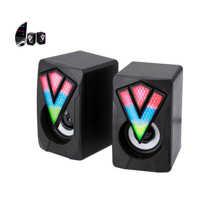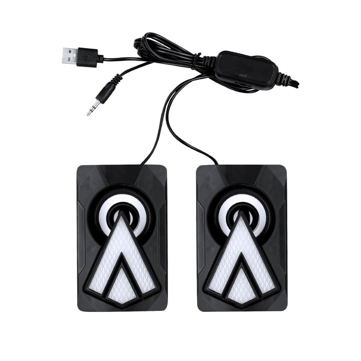 Gaming-Lautsprecher, die für ein immersives Spielerlebnis entwickelt wurden. Hergestellt mit mattschwarzem Gehäuse, mehrfarbigen LEDs und automatischen Lichteffekten. Enthalten ein integriertes Kabel mit Lautstärkeregler, 3,5 mm Klinkenanschluss und USB-Stromversorgung.