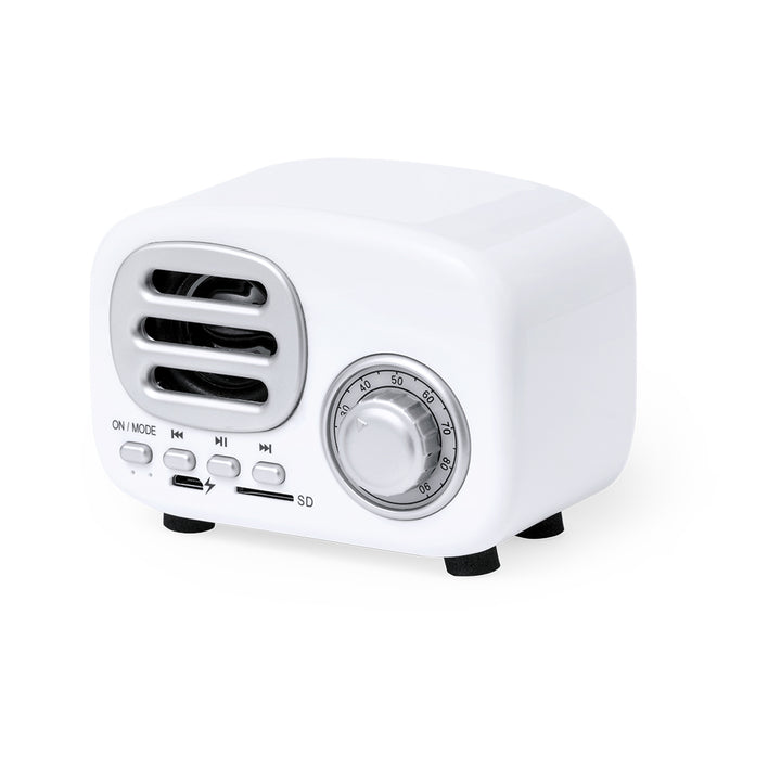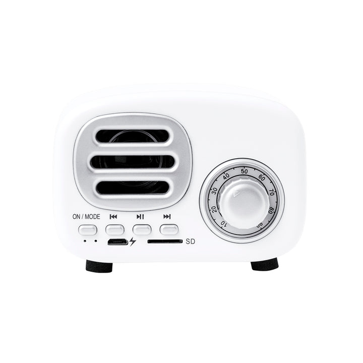 Kompakter Lautsprecher im Vintage-Stil, geformt wie ein altes Radio, mit 3 W Leistung. Mit Bluetooth-Verbindung für kabellose Freiheit, Musikwiedergabe und Stil zur gleichen Zeit. Mit Kontrollleuchten, Steckplatz für Micro-SD-Karten bis zu 64 GB und 500-mAh-Akku. Präsentiert in einer attraktiven Kraft-Design-Box, mit Bedienungsanleitung in Englisch und Spanisch.