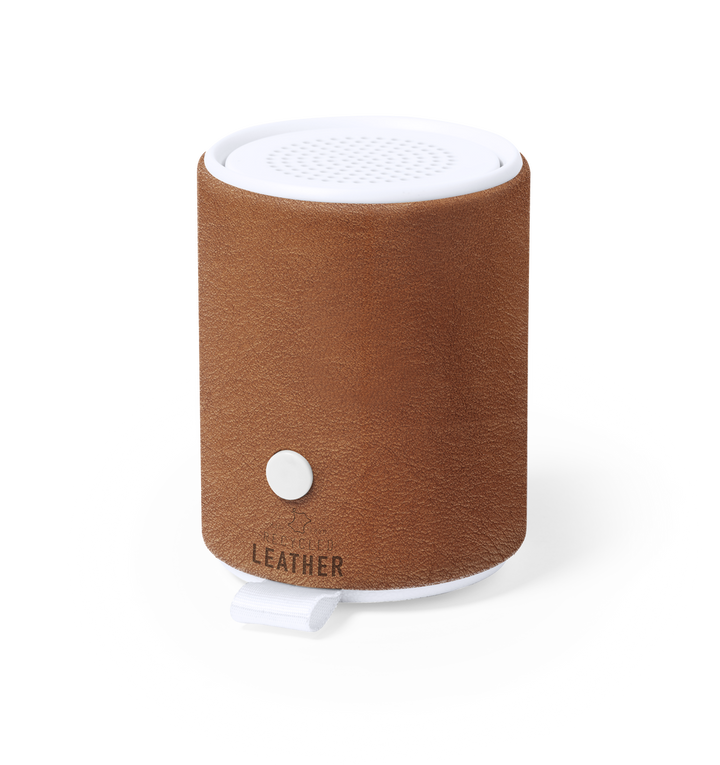 Altavoz Bluetooth® con carcasa fabricada en RABS y forrada en cuero reciclado.Con 3W de potencia y batería de 400 mAh. Conexión Bluetooth® 5.0, con ranura para tarjeta micro SD y base antideslizante. Incluye cable cargador Tipo C y manual de instrucciones en español e inglés. Presentado en caja individual de diseño kraft.El material RABS o ABS Reciclado y el cuero reciclado proceden del reciclado de artículos al final de su vida útil. Los materiales reciclados empleados incorporan la certificación RCS, que garantiza el origen reciclado de los mismos.