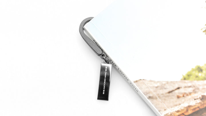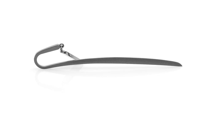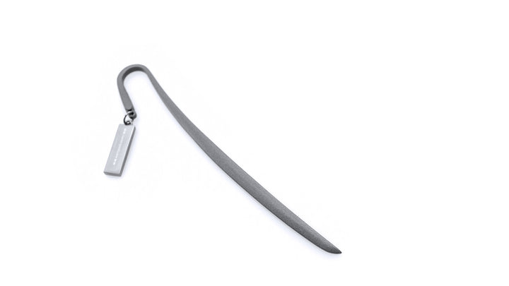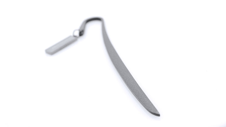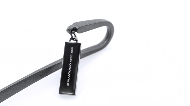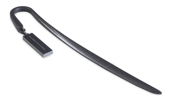 Metall-Lesezeichen von Antonio Miró in einer eleganten, dunkelgrauen Ausführung mit dem Markenlogo.
