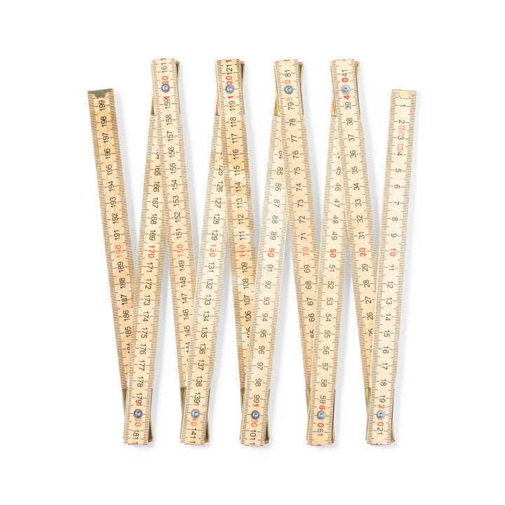 Klassisches Tischlerlineal aus Naturholz. Zusammenklappbar, mit 10 Segmenten und 2 m Länge.