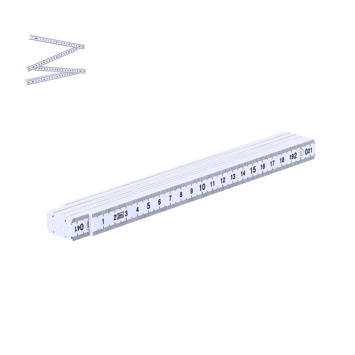 Faltbares 2 Meter Maßband aus widerstandsfähigem Fiberglas. Mit sichtbarer schwarzer Skala in Zentimetern auf beiden Seiten. Mit verstellbaren Positionen auf 90°, 180° und 270° für mehr Vielseitigkeit.