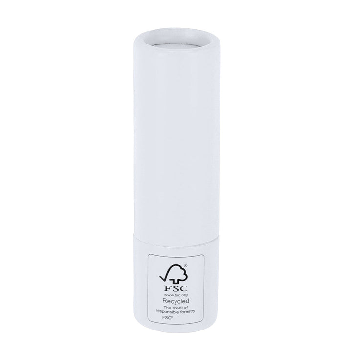 Lippenbalsam aus FSC-zertifiziertem recyceltem Karton. Vanilleduft. SPF15-Schutz. Dermatologisch getestet. FSC-Label auf der Verpackung.